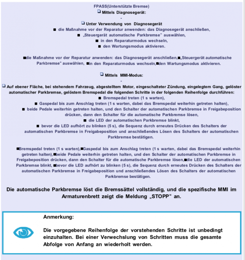 Parkbremse lösen, Motor aus, Gang rein, Zündung an, Bremse treten und 1 Sek warten, dann zusätzlich das Gaspedal bis zum Anschlag drücken und dann den noch den Schalter für die Parkbremse in Freigabeposition drücken. Dann sollte von der Parkbremse die LED zum Blinken anfangen und dann innerhalb 5 Sek den Schalter für die Parkbremse erneut drücken und dann sollte die Parkbremse im Wartungsmodus sein.