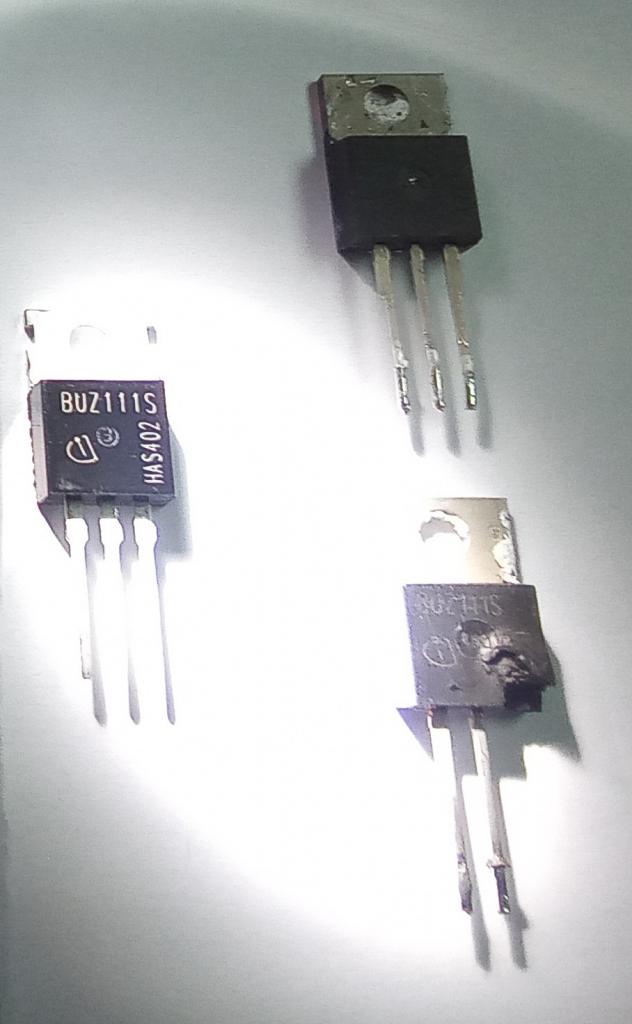 Siehe Foto mit den neuen BUZ111S MOSFETs links und den alten ausgetauschten rechts, einer davon mit weggebranntem Kontakt.