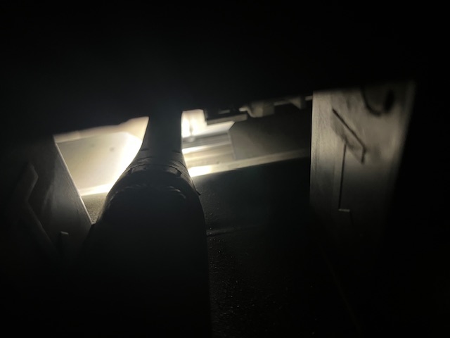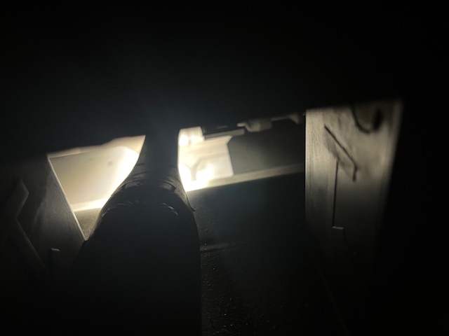 Mittelkonsole ist ausgebaut. Stablampe steckt im Auslassschacht, aus dem immer (ist so) nur kalte Luft kommt.
