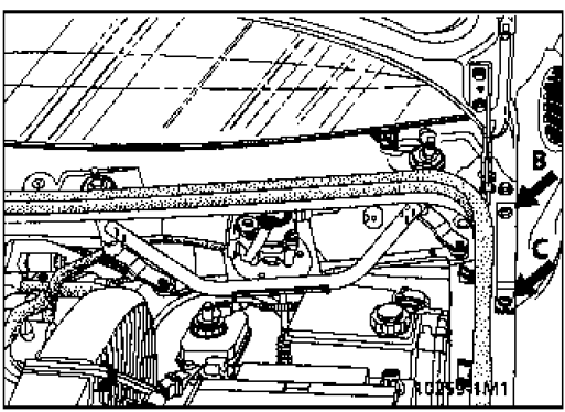 Das Windlaufblech entfernen, dabei die Schläuche des Scheibenwaschbehälters an der Dreifach-Steckverbindung abklemmen.
